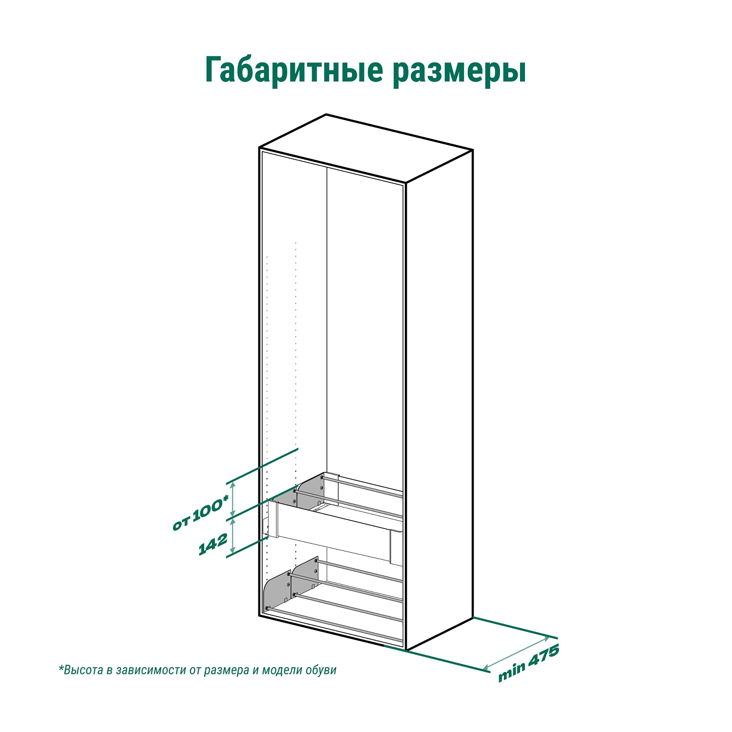 Поскольку профиль подставки для обуви можно устанавливать на двух уровнях, система хранения подходит для обуви любого размера, начиная с 35.